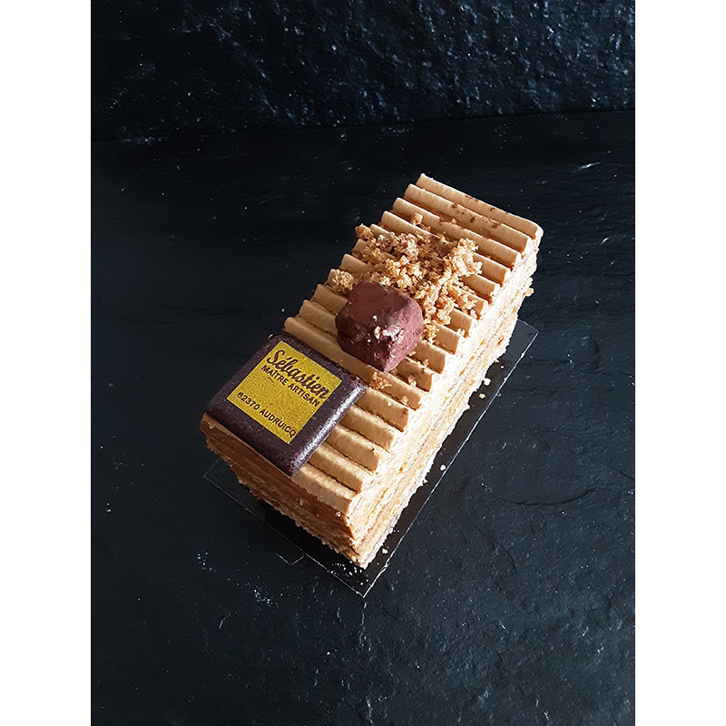 Sur une base d'un biscuit amande, retrouvez un croustillant praliné et une crème légère à la chicorée. Décor velours chocolat.