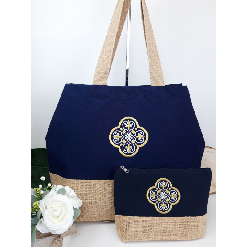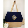 Grand sac fourre-tout en coton avec fond laminé en toile de jute naturel.