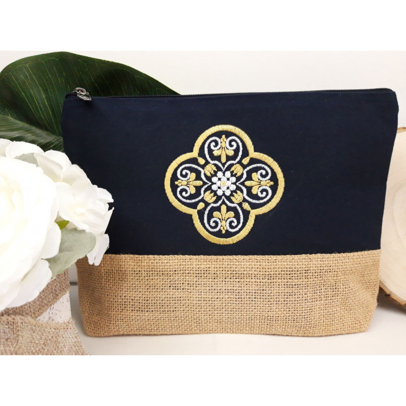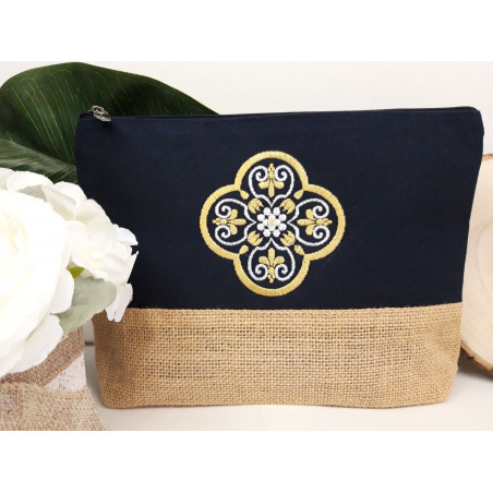 Pochette en toile de coton avec base contrastée en jute naturelle laminée.