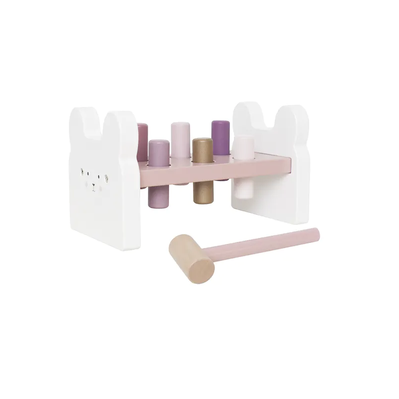 Banc de martèlement classique entièrement en bois dans de belles couleurs avec un joli lapin sur le côté. Votre enfant pourra exercer sa coordination et le meilleur de tout, peu importe la force avec laquelle il frappe ! Le banc de martèlement est un jouet amusant qui aide votre enfant à exercer sa coordination main-œil. Frappez toutes les formes avec le marteau, puis quand elles sont toutes complètement enfoncées, retournez-les et recommencez.