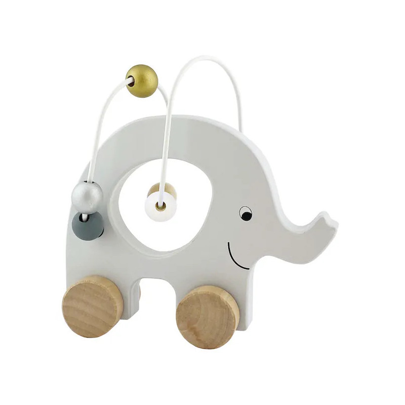 Jouet à tirer animal en bois massif, en forme d'éléphant. Avec des roues comme pieds, le petit animal se roule facilement sur les tapis et n'importe où dans la maison. L'éléphant a également un boulier autour de son corps avec 5 billes de différentes couleurs.