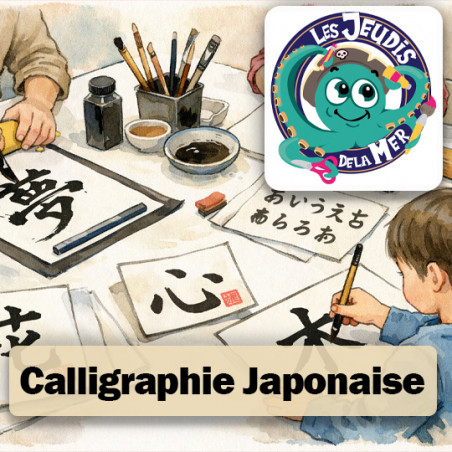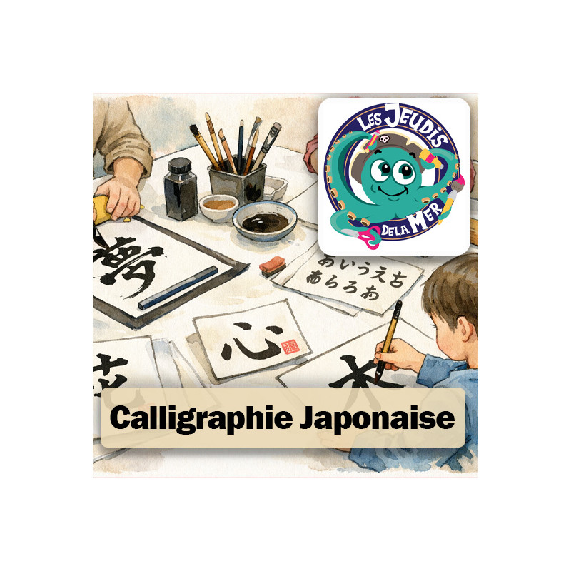 Quand l’encre rencontre la mer… Initiation des enfants à la calligraphie japonaise (shodō) et à la manipulation du pinceau et de l’encre pour écrire son prénom et des mots inspirés de la mer.