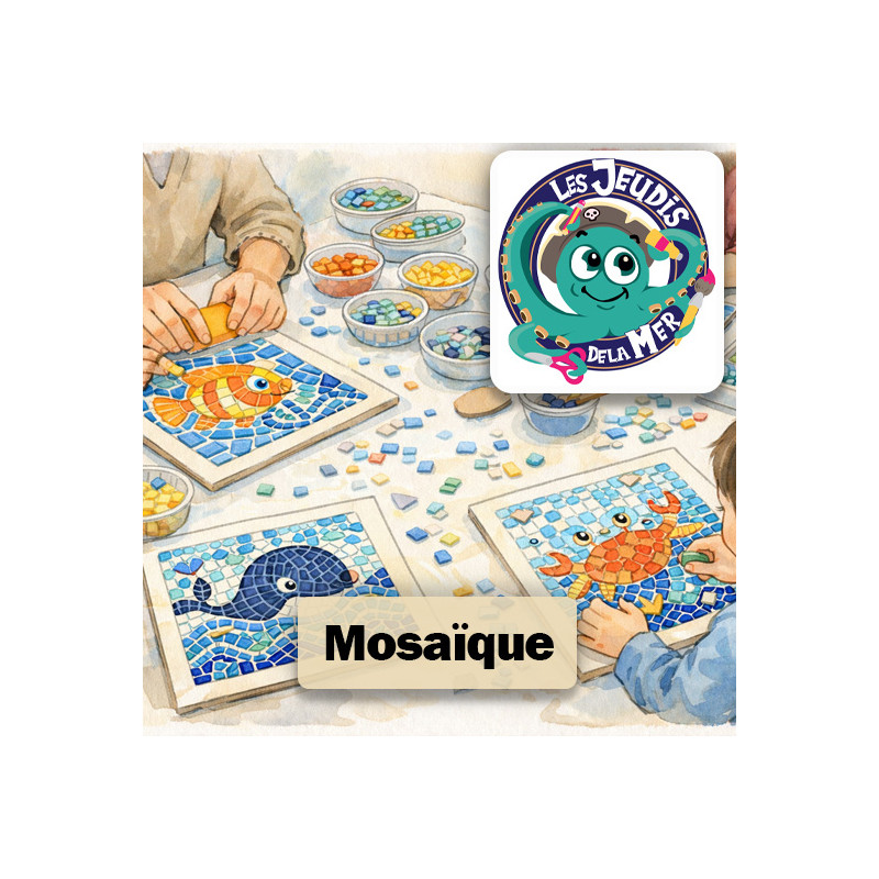 Créer la mer avec des morceaux de couleur ! Poissons rigolos, vagues scintillantes et trésors marins attendent les enfants pour un atelier mosaïque plein d’imagination.