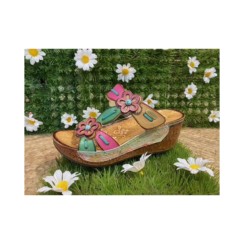 Mule compensée 1 velcro avec fleurs sur les côtés Couleur dominante rose et vert