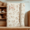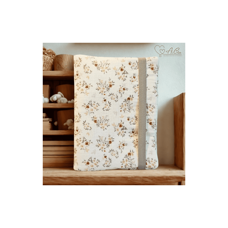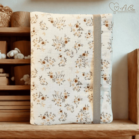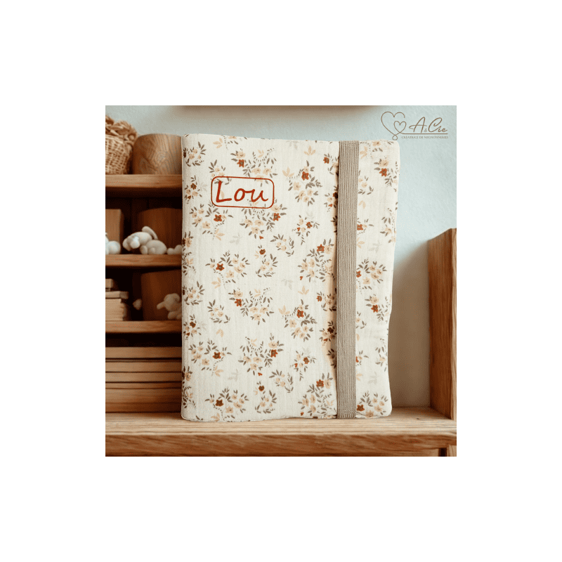 Protège carnet de santé personnalisable Charme d’Antan en double gaze écru, délicatement orné de fleurs caramel et poudrées au feuillage gris souris.